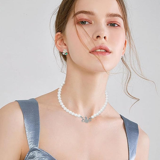 Y2K Perlenhalskette Silber - Planet Anhänger