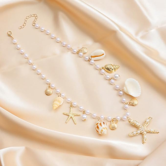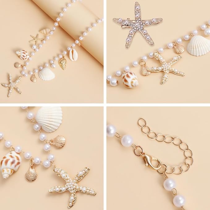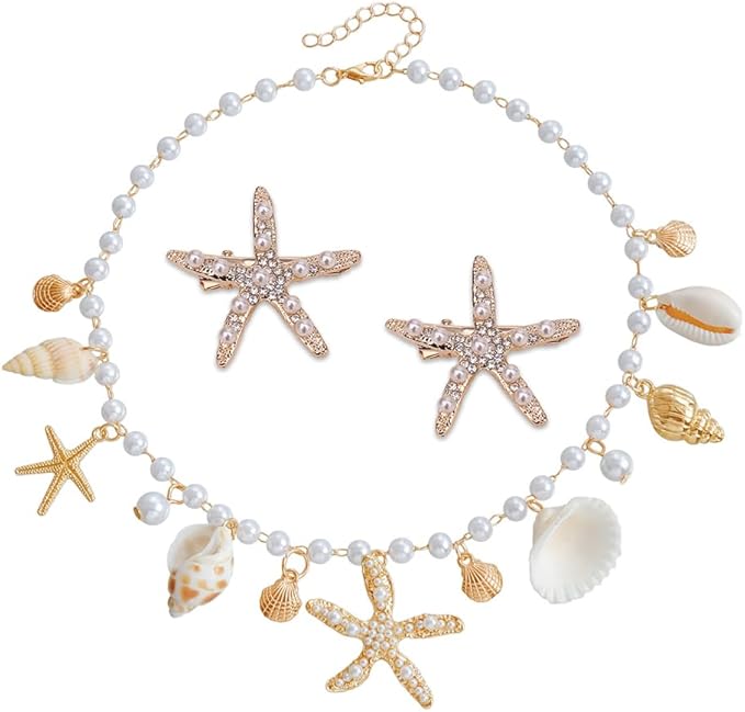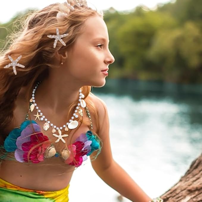 Sie erhalten 2 x Seestern Haarspangen und 1x Meerjungfreu Muschel Halskette.